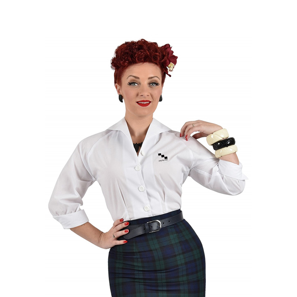 Embrace timeless style with this classic white blouse, featuring a sleek, button-down design and a subtle logo detail on the chest. Perfect for pairing with skirts or trousers, this versatile piece adds a touch of elegance to both casual and formal looks. Ideal for a polished, chic wardrobe.